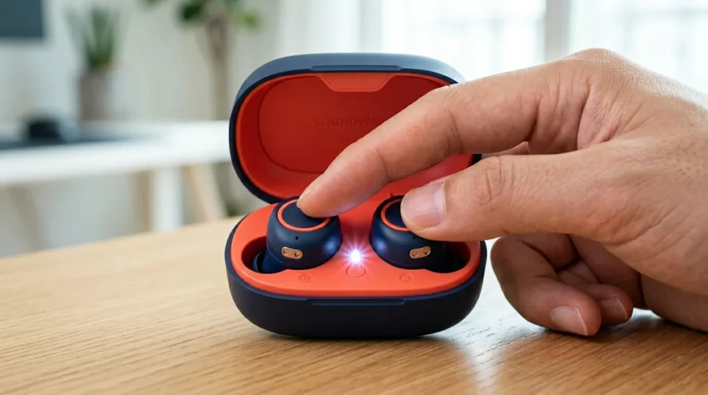 첫째, 이어폰 배터리예요. 완전 방전된 이어폰은 블루투스 신호 자체를 내보내지 못해요. 케이스에 넣고 최소 15~30분 충전 후 재시도해 보세요.